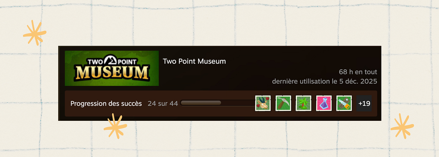 Et puis en 2025, en regardant une émission de Origami, j’apprends qu’ils préparent Two Point Museum : un jeu de gestion de musée. Autant dire que mon cerveau a immédiatement fait oui.