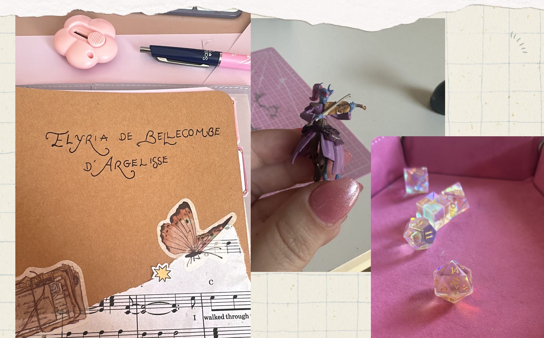 Quelle joie pour moi de pouvoir incarner des personnages, de peindre mes propres figurines, d’acheter des dès incroyables… J’ai pu jouer 5 persos différents en une année, 3 pour des one shot et 2 qui sont en cours. Ma préférée ? Mon Elyria, ma barde d’amour, qui bien évidemment a une backstory encore secrète pour les autres joueurs…